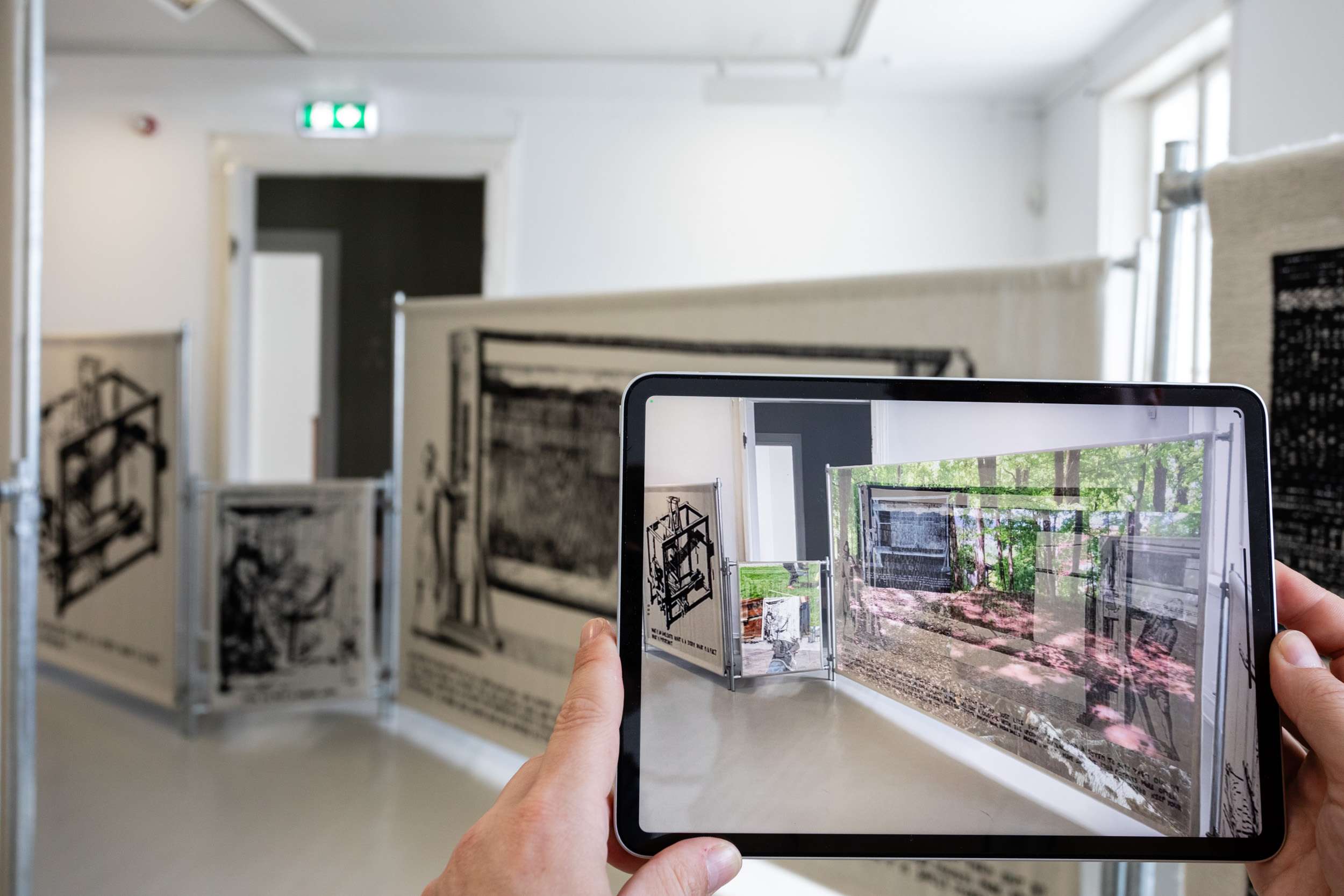 Twelve Jacquard-woven tapestries on a foldable room divider, twelve videos projected onto the tapestries in AR. Worsted wool, polyester, mercerized cotton, galvanized steel, video, digital tablet, AR app. Installation: variable dimensions. AR film: 12 parts, 1’ each.