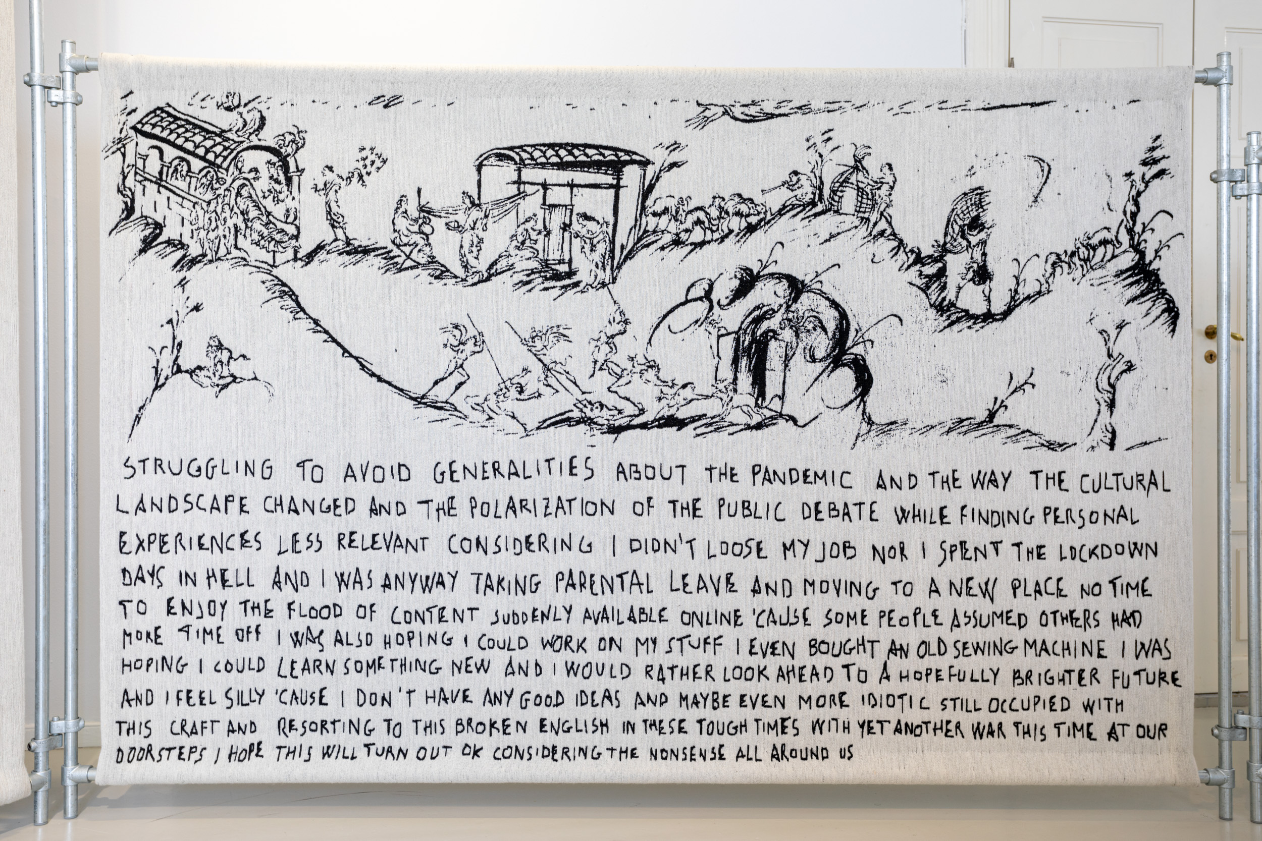 Twelve tapestries depicting men weaving at their loom, captioned by personal notes revolving around artistic labor and everyday life as interconnected spheres. Every month for a year, a tapestry was inserted into a different context, ranging from domestic settings to public spaces, from social situations to remote locations. They were worn as a garment or blanket, used as a sun shield or beach towel, or included in artistic actions and still-life compositions. They were presented in art exhibitions, hung in the forest, or carried around in a bag and shown upon request. The project is presented as an installation including a film in 12 chapters, each projected onto its respective tapestry, which can be viewed through an AR app designed for digital devices.